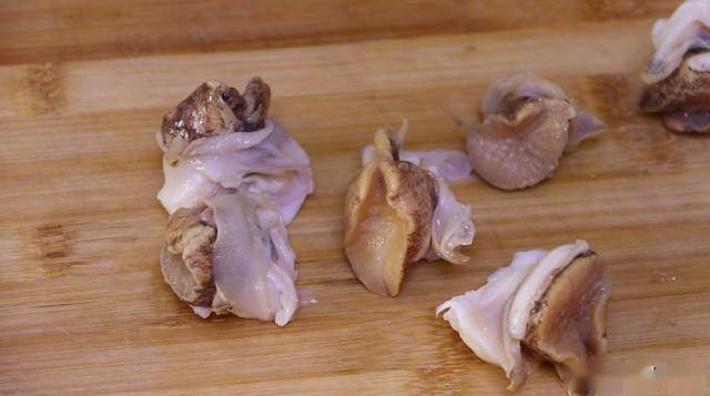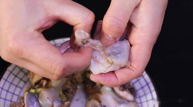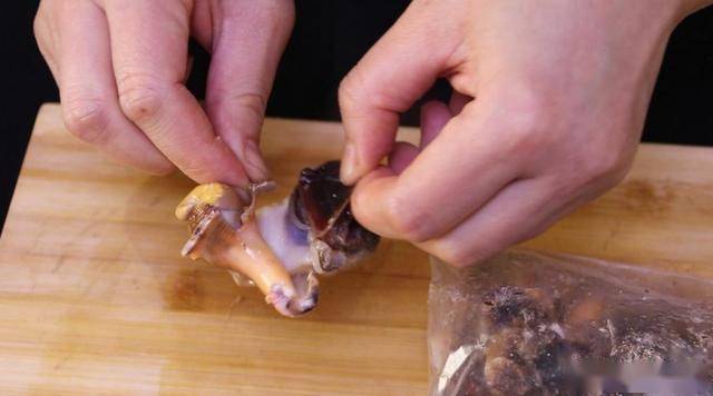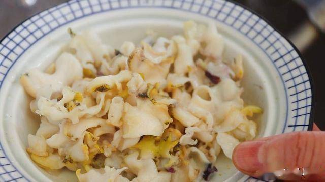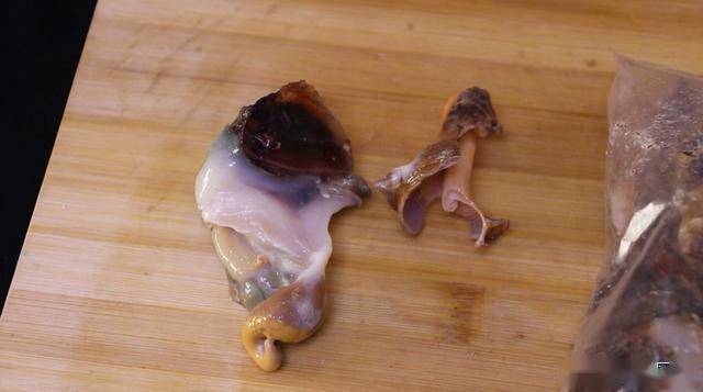 摘除螺肉中間的內臟和尾部,我們只取海螺的頭部,用鹽抓洗揉搓,搓出黏液,再用清水清洗干凈。
