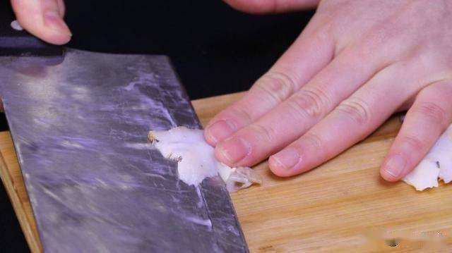 用廚房紙巾或者干凈的毛巾吸掉海螺肉表面的水分。一手按住螺肉,一手拿刀片螺肉,把螺肉片成薄薄的一片。