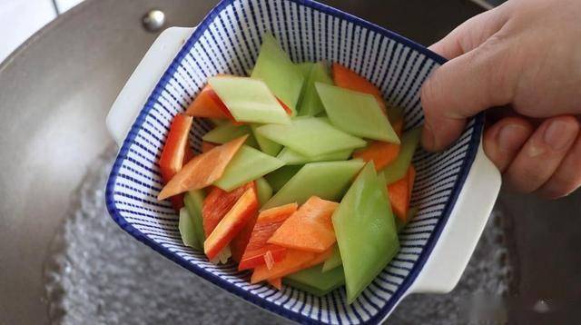 鍋內換清水,燒開。倒入切好的紅椒、胡蘿卜、萵筍,焯個20秒撈出。